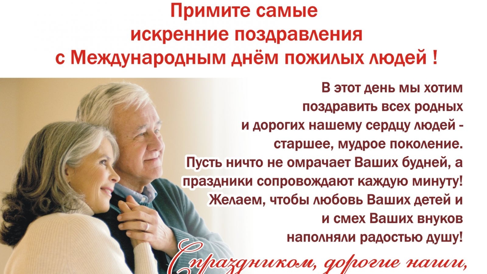 В Международный день пожилых людей желаем вам улыбок, добра и человеческого тепла. Пусть каждый будет одарен вниманием и пониманием родных, заботой и душевностью. Долгих вам лет жизни, здоровья и мира в душе. За вашу жизнь вы сделали так много, что заслуживаете уважения, достатка и благополучия. Счастья вам!