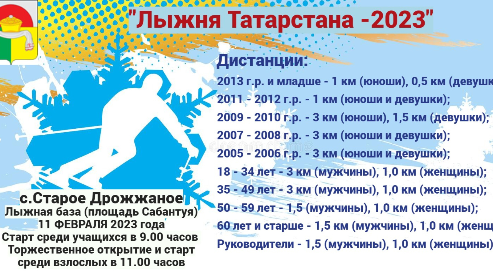 Приглашаем всех активистов принять участие на лыжных соревнованиях в селе Старое Дрожжаное на площади Сабантуя. Начало в 9.00 часов