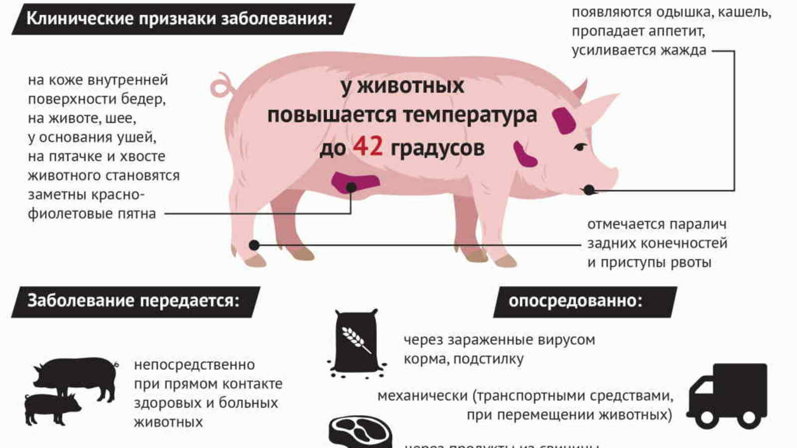 Свиньи заражаются при контакте с больными и переболевшими животными: через корма (особенно пищевые отходы), воду, предметы ухода, транспортные средства, загрязненные выделениями больных животных, а также через контакт с трупами павших свиней и продуктов убоя зараженных свиней. Наиболее часто к появлению АЧС приводит скармливание свиньям непроваренных пищевых отходов домашней кухни, различных пищеблоков и столовых, боенских отходов, а также комбикормов и зернопродуктов, не прошедших термическую обработку. Болезнь переносят домашние и дикие животные, птицы, грызуны и насекомые.