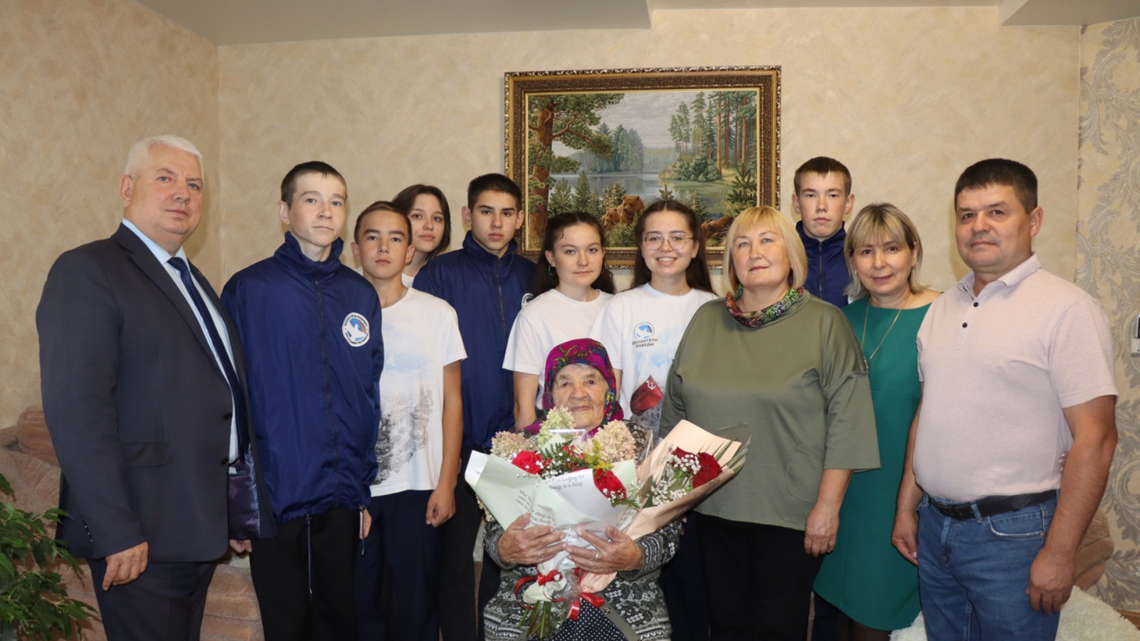 В этот день именинница принимала теплые слова поздравлений от заместителя Главы Дрожжановского муниципального района Алексея Ярухина, от секретаря Большеаксинского сельского поселения Светланы Айкиной и волонтеров — учеников 11 класса Большеаксинской средней школы. Гости поздравили ветерана с юбилеем, вручили юбилярше поздравительную открытку от имени Президента Российской Федерации Владимира Путина, подарки от имени главы Дрожжановского муниципального района Марата Гафарова, цветы, пожелали здоровья, счастья, долгих лет жизни.
