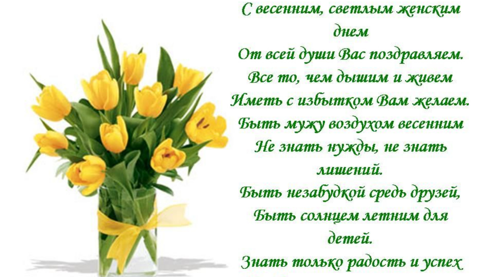 Дорогие женщины, поздравляем с Международным женским днем! Желаем вам вечной красоты и обаяния, исполнения всех желаний, удачи и профессиональных успехов! Любите и будьте любимы, и пусть в вашем доме всегда будет спокойствие, поддержка и уют!
