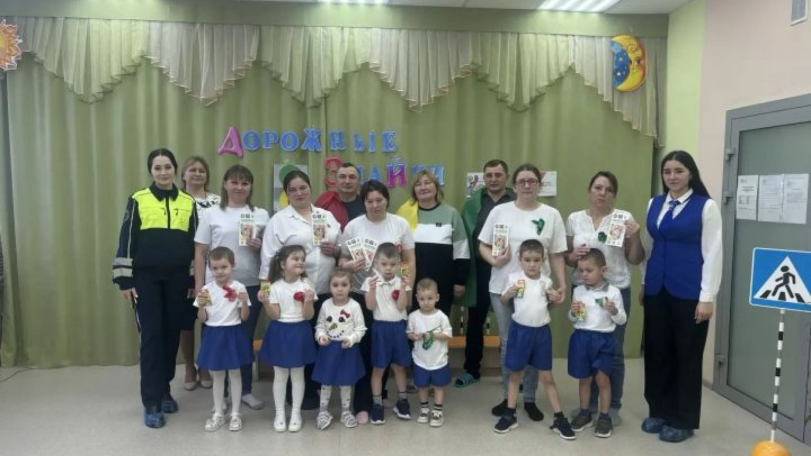 Для закрепления материала детям показали обучающие видеоролики с портала Сакла.ру. По итогам встречи все воспитанники получили световозвращающие элементы, а родители — тематические памятки.