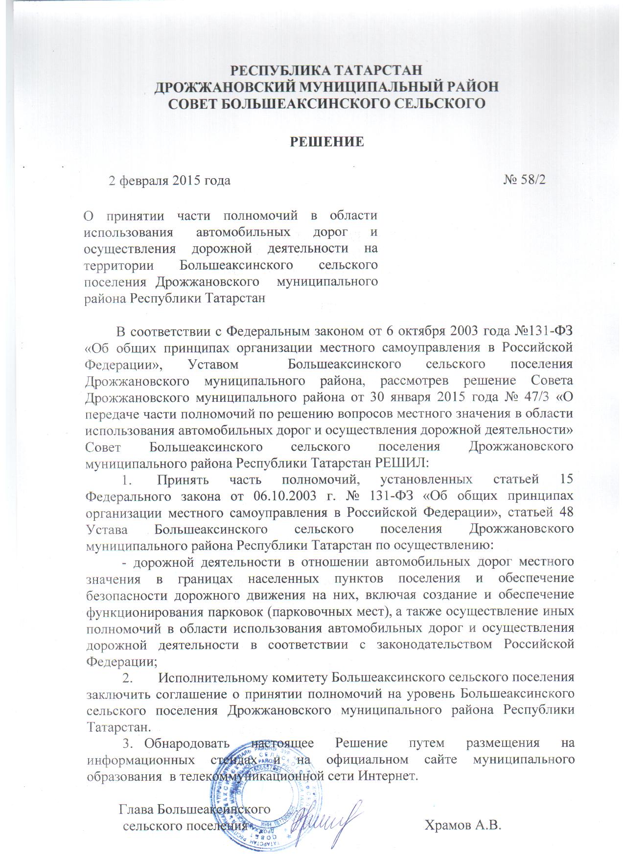 решение № 58/2 от 02.02.2015 г."О принятии части полномочий в области использования автомобильных дорог и осуществления дорожной деятельности"